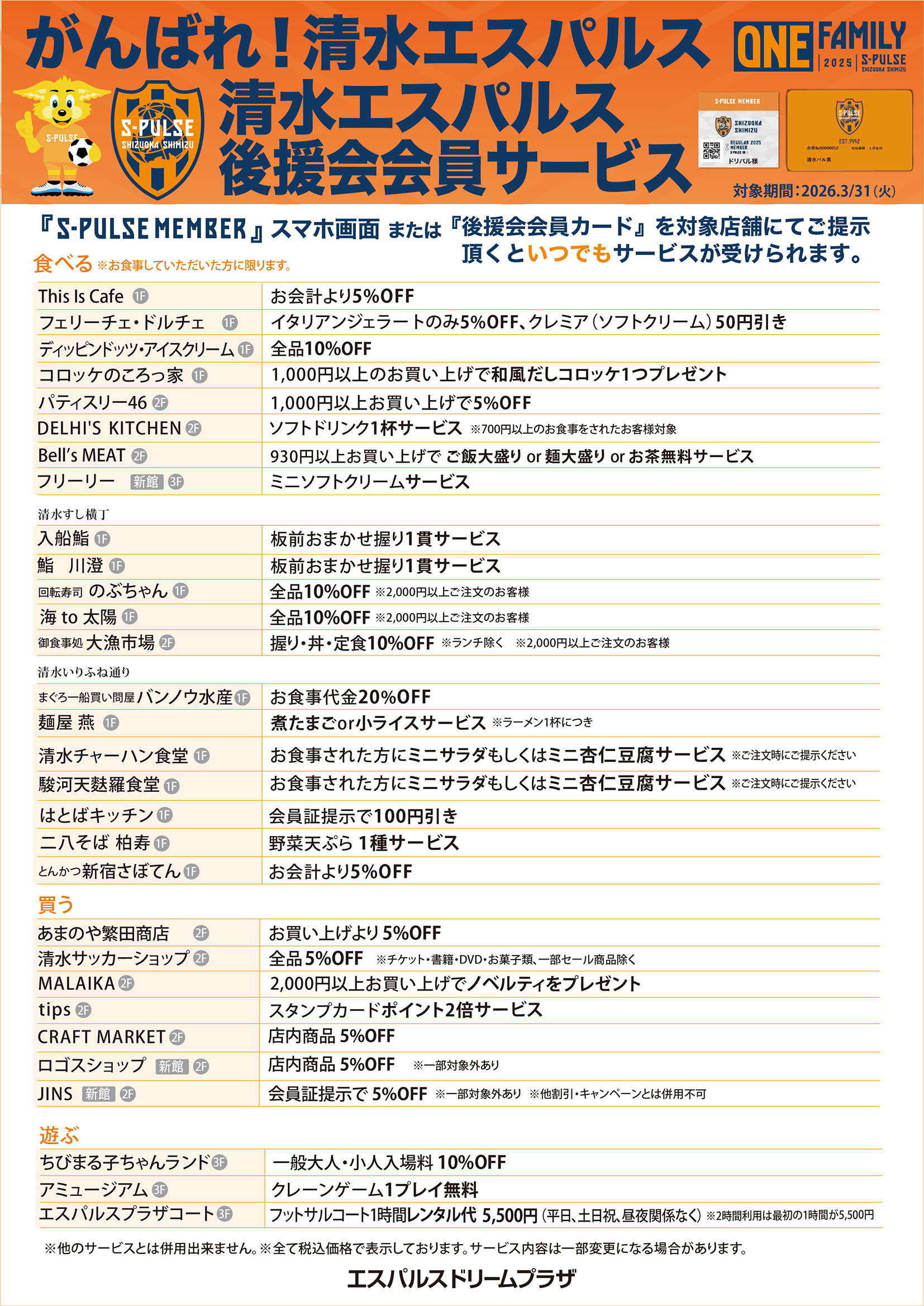 「S -PULUSE MEMBER スマホ画面」または「清水エスパルス後援会カード」を各店舗レジにてご提示ください。