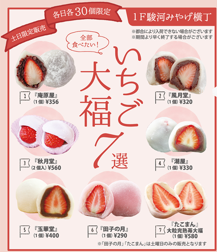 県内の老舗和菓子店7店舗(庵原屋、風月堂、秋月堂、潮屋、たこまん、玉華堂、田子の月)が手がけるこだわりのいちご大福を販売!