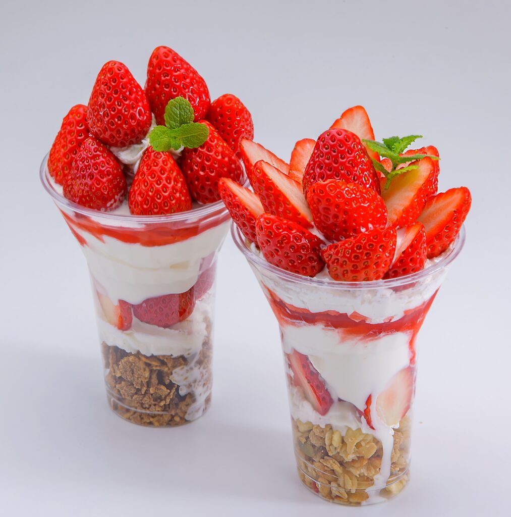 久能産いちご半パックを使用し、自分だけのオリジナルパフェを作れる「いちごパフェづくり体験」を開催。