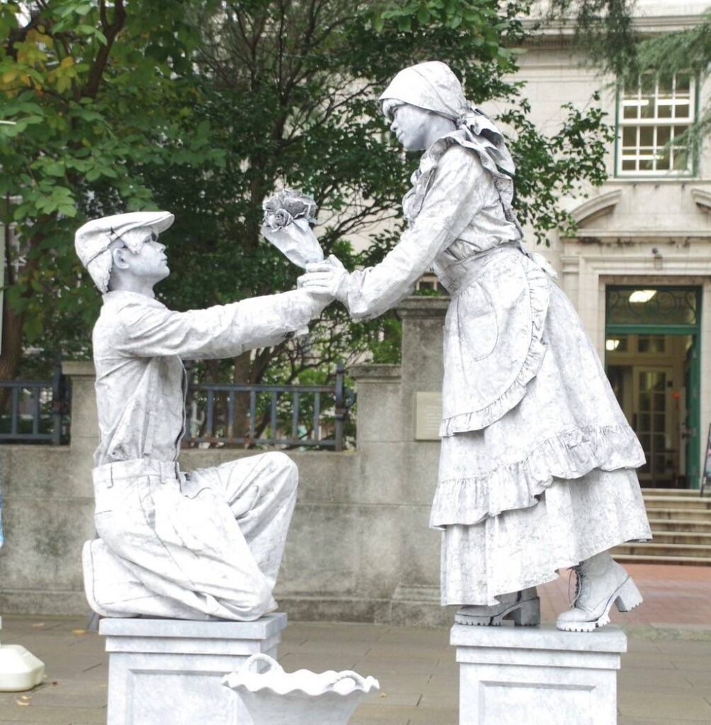 少年と少女の石像を模した2 人組のスタチューパフォーマンス。