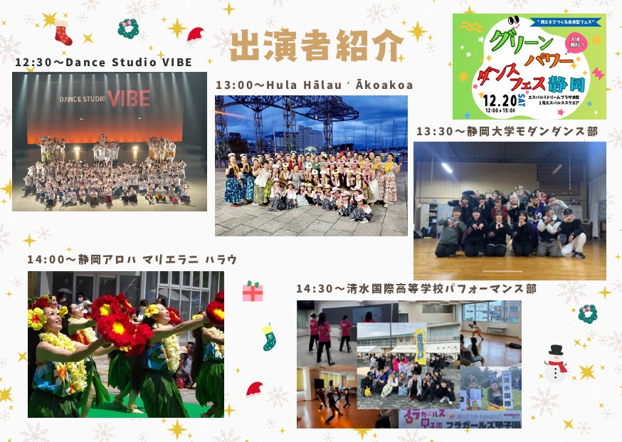 内容: キッズダンス、フラダンス、大学生・高校生ダンス、オタ芸、大道芸など