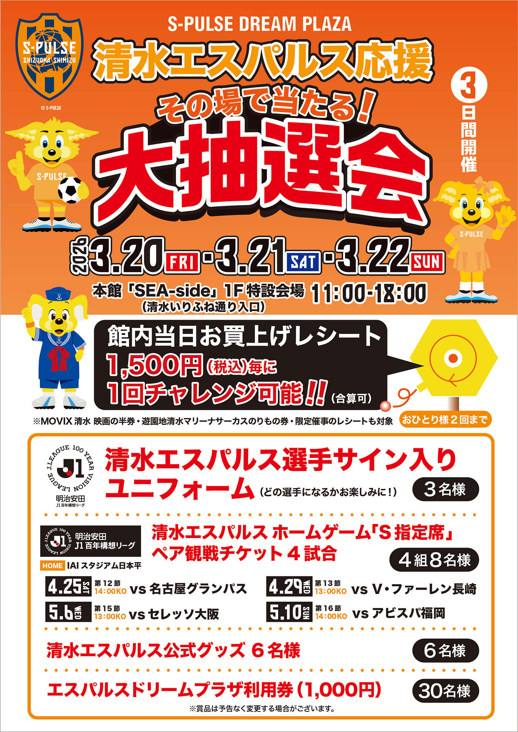 3月20日(金·祝)~22日(日)までの3日間、「清水エスパルス応援!大抽選会」を開催!