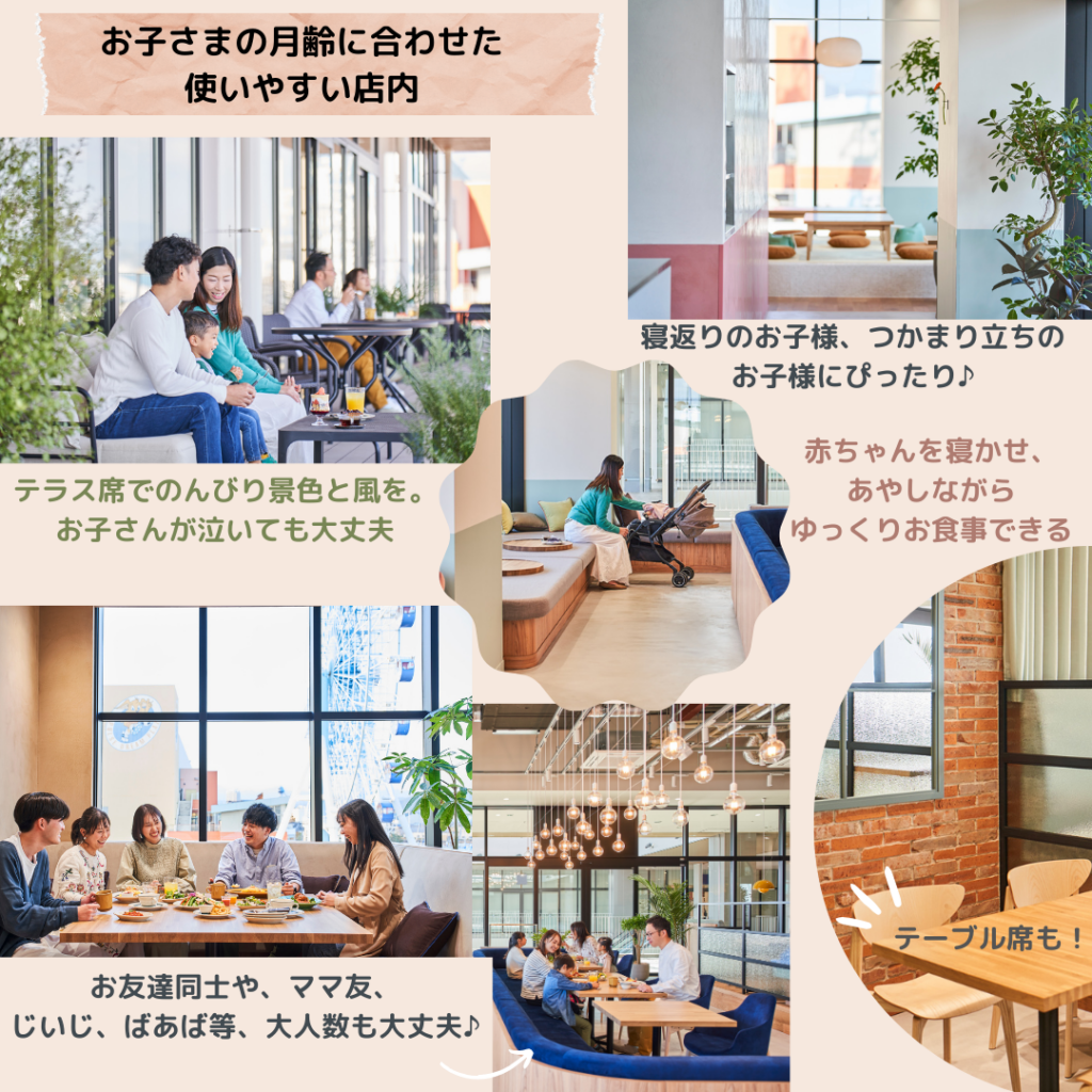親子連れでお出かけしたときに重宝する、みんなでちょっと一息つくことができるスペースをご用意しています。