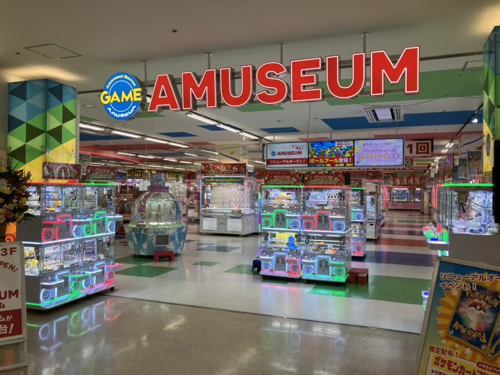 明るい店内の大型ゲームコーナーです。2025年12月にリニューアル。