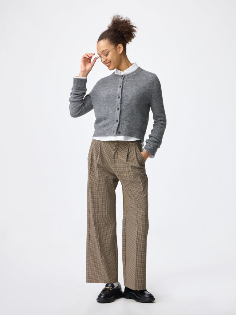 ほどよくコンパクトなサイズ感で、カーディガンとしてはもちろん、ボタンを閉じてトップス使いも可能なアイテムです。