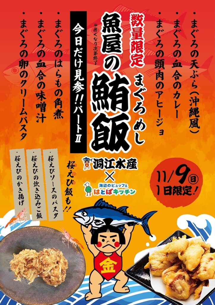 11月9日(日)はとばキッチン 魚屋の鮪飯(まぐろめし)開催! レストラン・カフェ 2025.10.25 SHARE 11月9日(日)11時OPEN はとばキッチン×洞江水産 コラボ企画 「魚の鮪飯(まぐろめし)パートⅡ」開催! 今回は「桜えび飯」も登場! まぐろ料理、桜えび料理を食べつくせ! 店舗情報 店舗名 G-15 はとばキッチン[ビュッフェレストラン] 場所 SEA-side 1F G-15 はとばキッチン フロアガイド 閉じる SHARE