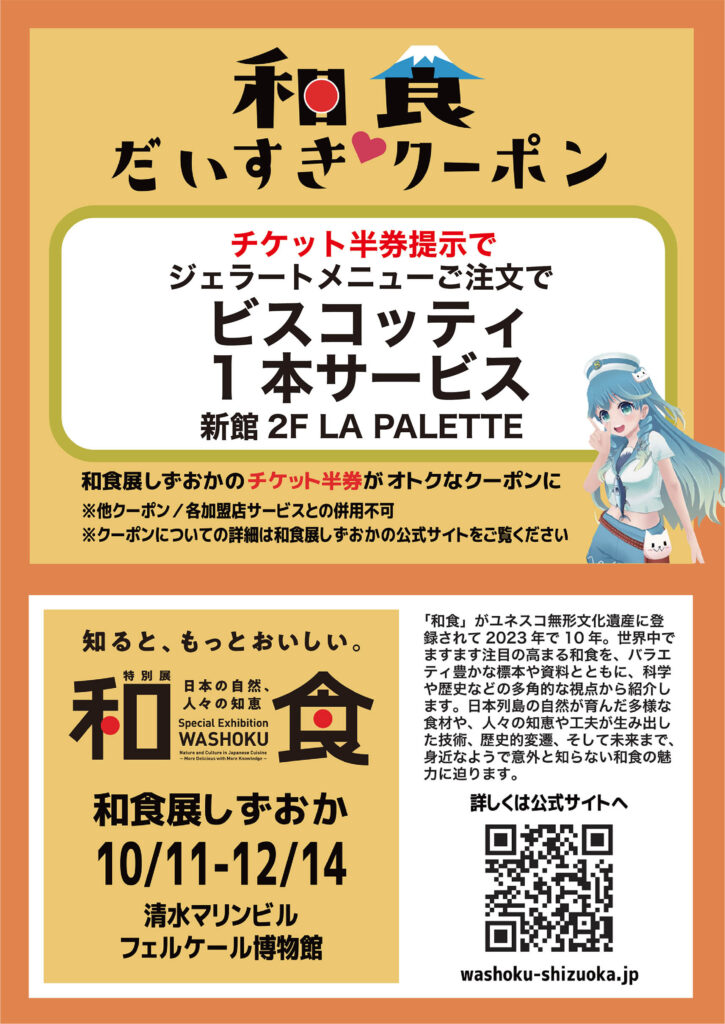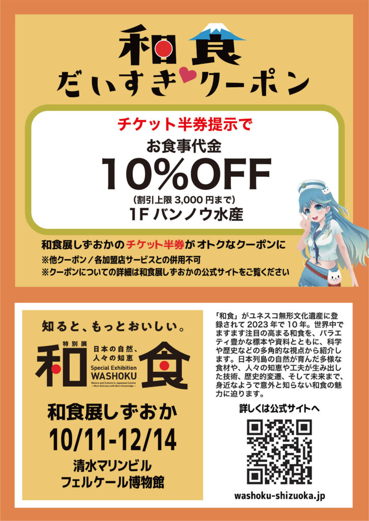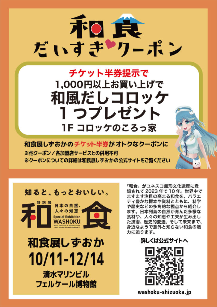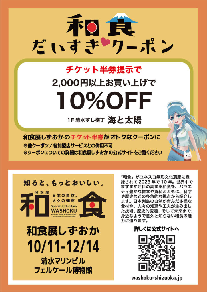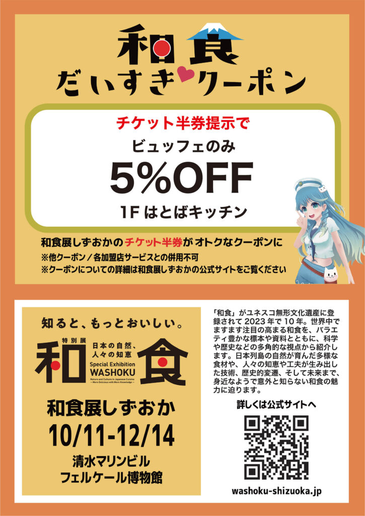 【10月11日~12月14日】和食だいすきクーポン 半券サービスのご案内 ファッション・雑貨 シネマ・エンタメ・サービス 食料品・みやげ レストラン・カフェ 清水すし横丁 テイクアウト・軽食 フードコート 2025.10.06 SHARE エスパルスドリームプラザでは、清水マリンビル・フェルケール博物館にて開催の「和食展しずおか」にご来場のお客様へお得なサービスを実施いたします。 クーポンの使い方 サービス参加店舗・内容 和食展しずおか のサイトはこちらから SHARE