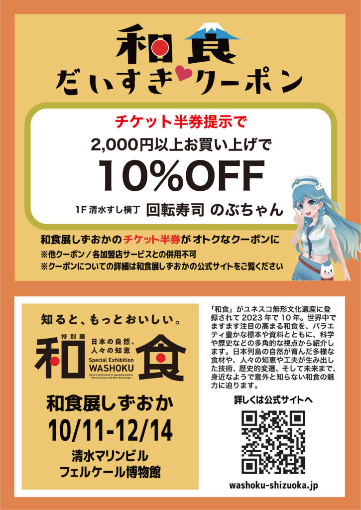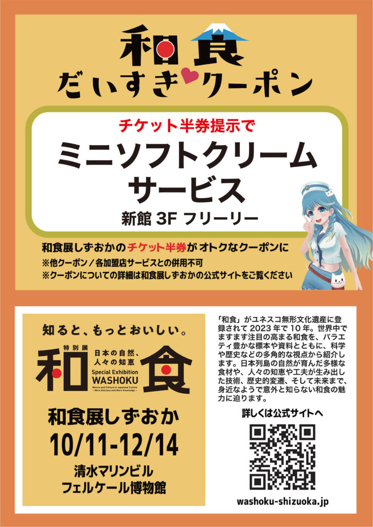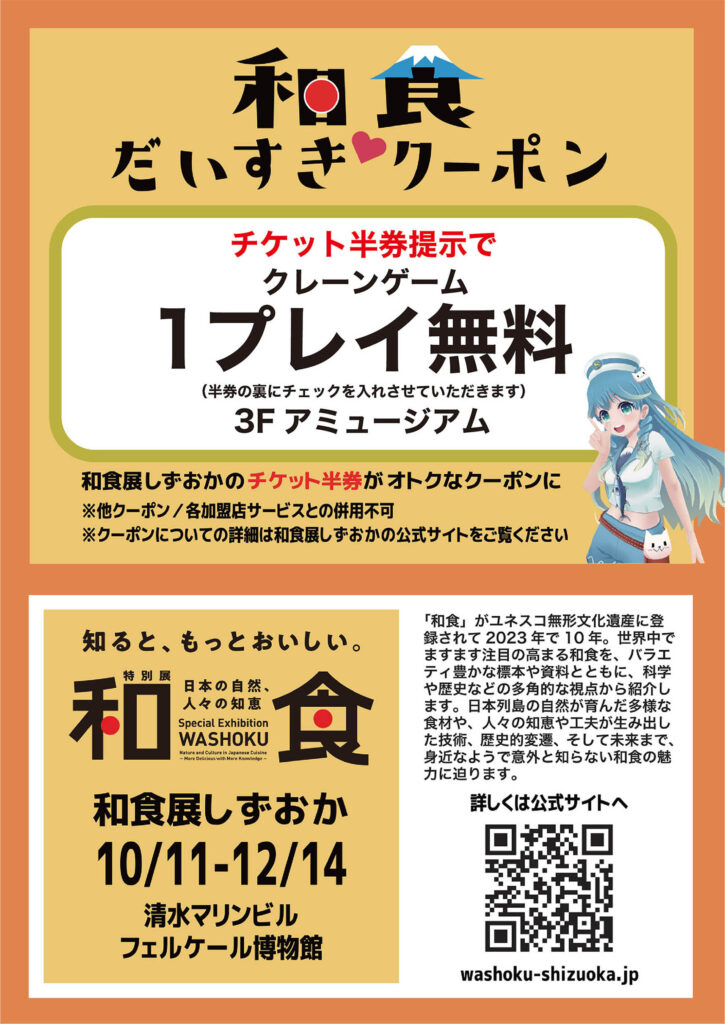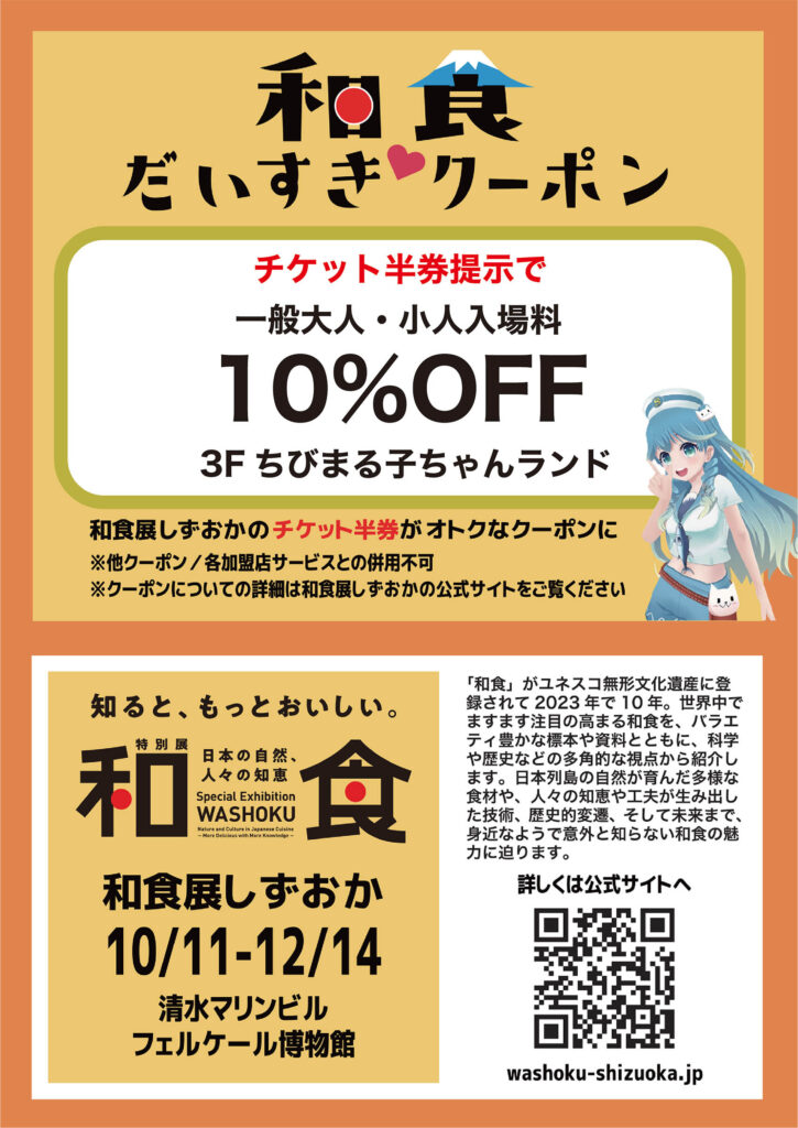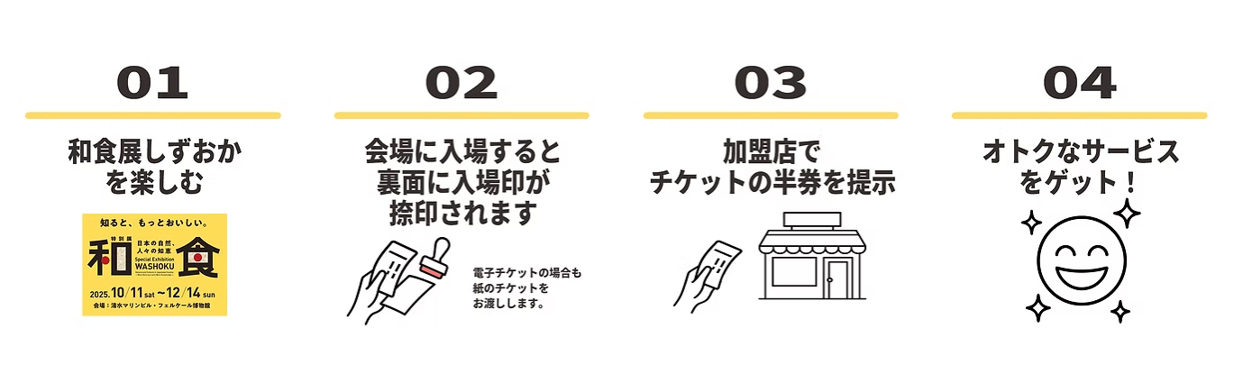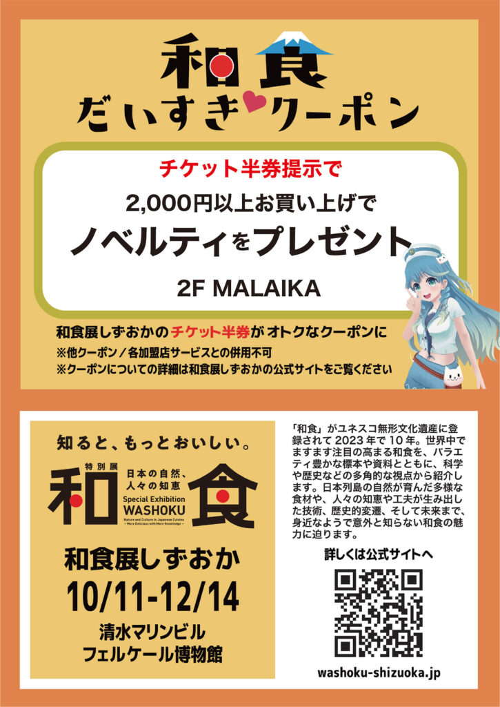 【10月11日~12月14日】和食だいすきクーポン 半券サービスのご案内 ファッション・雑貨 シネマ・エンタメ・サービス 食料品・みやげ レストラン・カフェ 清水すし横丁 テイクアウト・軽食 フードコート 2025.10.06 SHARE エスパルスドリームプラザでは、清水マリンビル・フェルケール博物館にて開催の「和食展しずおか」にご来場のお客様へお得なサービスを実施いたします。 クーポンの使い方 サービス参加店舗・内容 和食展しずおか のサイトはこちらから SHARE