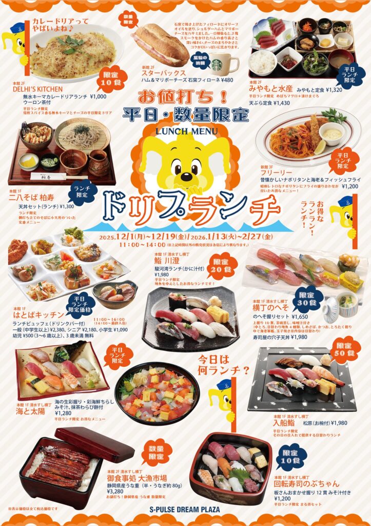 お値打ち!平日(数量限定)ドリプランチ! レストラン・カフェ 清水すし横丁 テイクアウト・軽食 フードコート 2025.11.30 SHARE お値打ち!平日(数量限定)ドリプランチ! 2025年12月1日~12月19日(金)平日限定(一部店舗を除く) 2025年1月13日(火)~2月27日(金)平日限定(一部店舗を除く) 店舗情報 店舗名 G-21 DELHI’S KITCHEN[エスニックフード] 場所 SEA-side 2F G-21 DELHI’S KITCHEN フロアガイド 閉じる 店舗名 G-30 family cafe restaurant freely[ファミリーレストラン] 場所 PARK-side 3F G-30 family cafe restaurant freely フロアガイド 閉じる 店舗名 G-24 みやもと水産[まぐろ料理・定食・丼もの] 場所 SEA-side 2F G-24 みやもと水産 フロアガイド 閉じる 店舗名 G-20 二八そば 柏寿[そば・丼もの・一品料理] 場所 SEA-side 1F G-20 二八そば 柏寿 フロアガイド 閉じる 店舗名 G-13 入船鮨エスパルスドリームプラザ店[江戸前寿司] 場所 SEA-side 1F G-13 入船鮨エスパルスドリームプラザ店 フロアガイド 閉じる 店舗名 G-14 御食事処 大漁市場[寿司定食・和食・丼] 場所 SEA-side 2F G-14 御食事処 大漁市場 フロアガイド 閉じる 店舗名 G-11 回転寿司 のぶちゃん[回転寿司、丼ぶり、定食] 場所 SEA-side 1F G-11 回転寿司 のぶちゃん フロアガイド 閉じる 店舗名 G-7 横丁のへそ 清水ドリームプラザ店[海鮮市場屋台寿司] 場所 店舗名 G-12 鮨 川澄[江戸前寿司] 場所 SEA-side 1F G-12 鮨 川澄 フロアガイド 閉じる SHARE