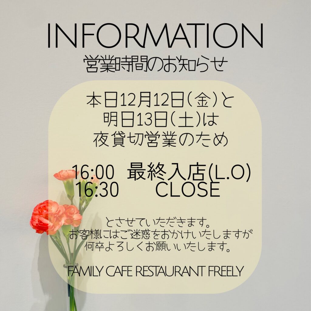 営業時間のお知らせ レストラン・カフェ 2025.12.12 SHARE 本日12月12日㈮と明日13日㈯は夜貸し切り営業のため 16時最終入店(ラストオーダー) 16時30分クローズとさせていただきます。 大変ご迷惑をお掛けいたしますが何卒よろしくお願いいたします。 店舗情報 店舗名 G-30 family cafe restaurant freely[ファミリーレストラン] 場所 PARK-side 3F G-30 family cafe restaurant freely フロアガイド 閉じる SHARE