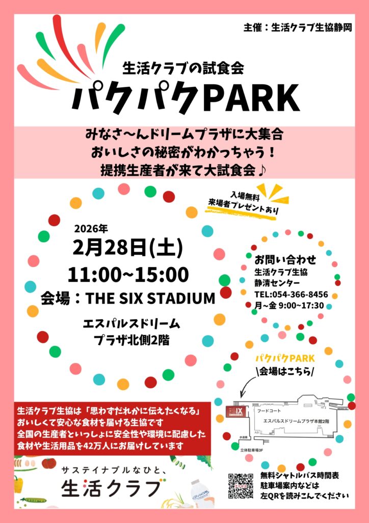 2月28日(土)生活クラブの試食会パクパクPARK開催! 場所SEA-side2階THE SIX STADIUM シネマ・エンタメ・サービス 2026.01.20 SHARE 2月28日(土) 生活クラブの試食会パクパクPARK開催! 場所 エスパルスドリームプラザ SEA-side2階 THE SIX STADIUM 時間 11:00~15:00 店舗情報 店舗名 G-25 THE SIX STADIUM[イベント&レンタルスペース] 場所 SEA-side 2F G-25 THE SIX STADIUM フロアガイド 閉じる SHARE