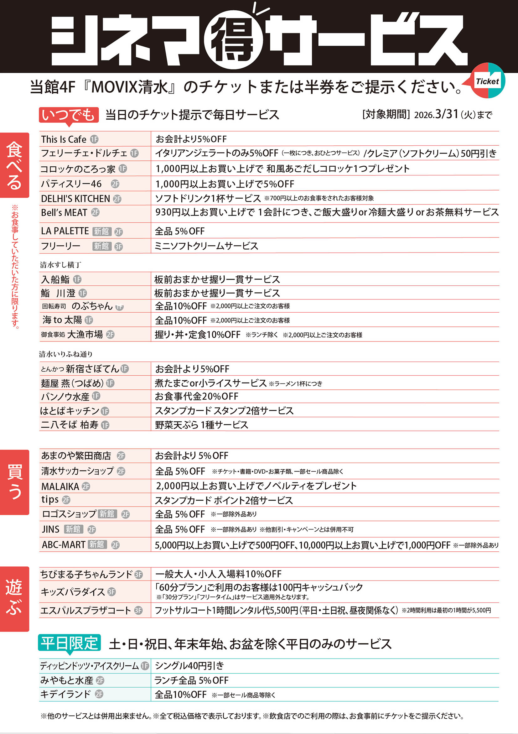 当館4F「MOVIX清水」のチケット(映画鑑賞後はチケット半券)を各店舗にご提示ください。
